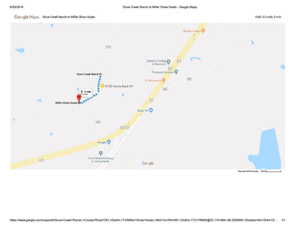 From Stephenville, go south on Highway 377. After you have gone approximately 8 miles, you will see signs for 377 Business through downtown Dublin. Do not go on 377 Business. Take the North Loop around Dublin but get in the right lane and slow down. Allsup's Convenience Store and Truck Stop will be on your left. Turn right onto CR 351 just as you come along side of Allsup's. Look down at your odometer and go about 4/10ths of a mile. Miller Show Goats is a left hand turn onto CR 497. If you are coming from Dublin north on Business 377, go approximately ¾’s of a mile, look for Prime Building Components and the Allsup's Convenience Store/Truck Stop to your left, turn left on CR 351 between the two businesses using the crossover just past Prime Building Components, go directly across the North Loop onto CR 351 and proceed as outlined above. If you are coming from Comanche to the south, you will take the North Loop around Dublin. You will easily see Allsup's on the right. Get in the left hand turn lane and cross the south bound loop onto CR 351, go 4/10th's of a mile and turn left onto CR 497.